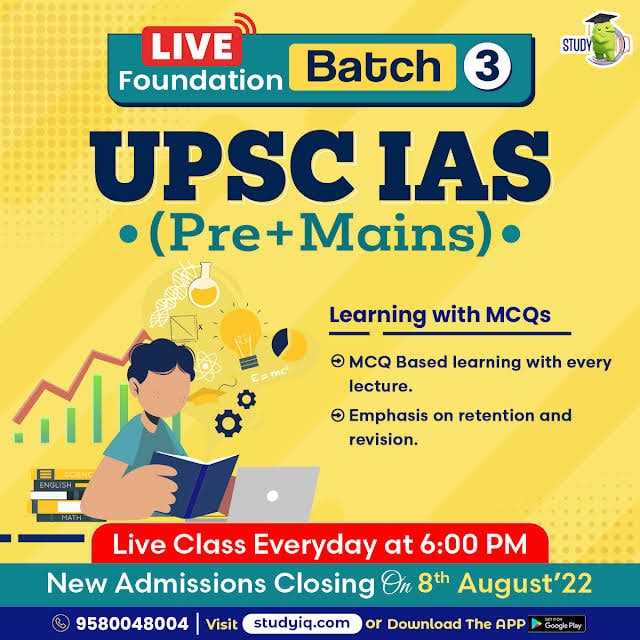 StudyIQ just started the UPSC Live Foundation Batch 3 for UPSC aspirants, Which will be very helpful in your UPSC exam preparation Because in this batch UPSC aspirants get many features like One-to-One Mentorship, Success in Prelims, Current Affairs Program, Prelims Test Series, Answer Writing, Success in SIP, IAS Live Session and Handmade notes etc. UPSC Live Foundation Batch 3 Classes are provided by top faculties of India and retired IAS. New admissions closing on 8th August'22. Live class Everyday at 6 PM. Enroll Now: