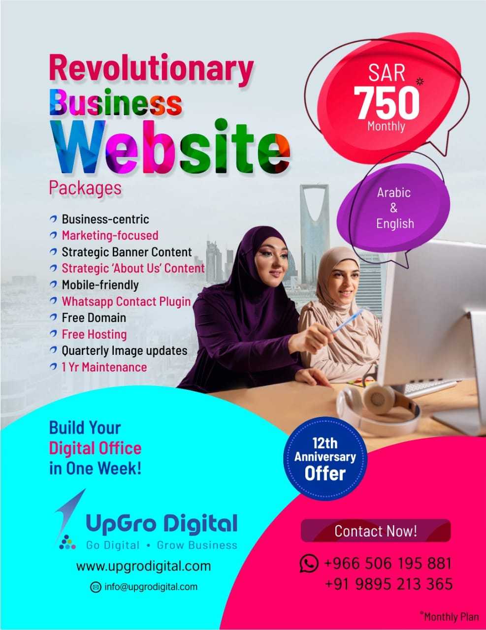 Vision 2030 opens Saudi Arabia to the world, to create new business opportunities. Almost the entirety of the population in Saudi Arabia uses internet presently. Besides the conventional offline market, the online market is a whole new world of opportunities. Without Online Presence, you are likely to miss out on new opportunities. Your business website in Saudi Arabia will allow your company to thrive and prosper. Drive traffic to your business with business websites from expert website development company in Saudi Arabia, UpGro Digital. We offer new website packages that are exclusive to business. Our marketing focused, strategic business website with in-built strategic content drives compounding growth to your business. Mobile friendly and revolutionary business websites are ready within your hand's reach at an affordable price. Grow your business digitally with the website development services package from UpGro Digital. Link to us NOW!