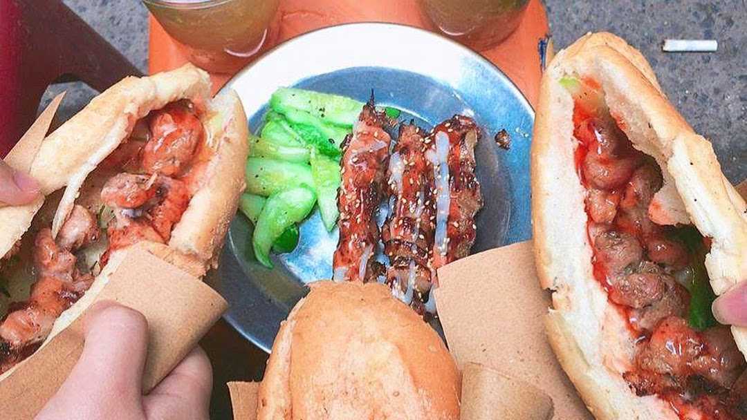 Banh mi sandwich - a crispy baguette filled with marinated meats, fresh vegetables, and a special sauce.