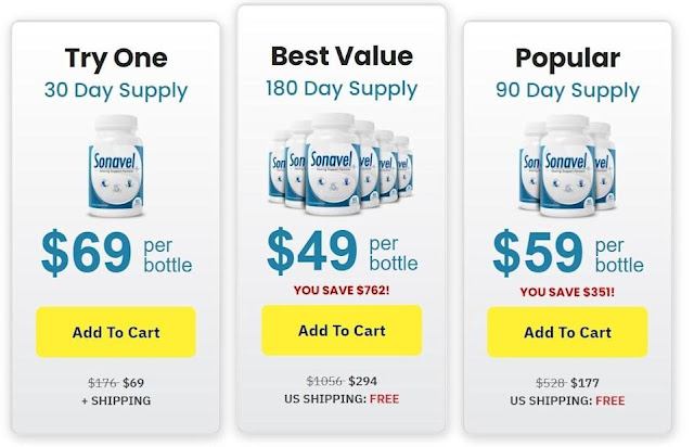 3 bottles of Sonavel capsules at $59 per bottle (90 day supply) + FREE shipping for a total of $177